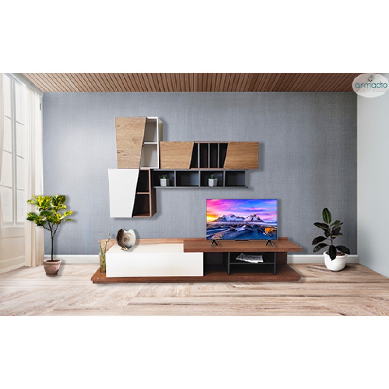 Σύνθεση με πολλούς αποθηκευτικούς χώρους με μοντέρνο σχεδιασμό που ξεχωρίζει. Κατασκευασμένη από ξύλ..