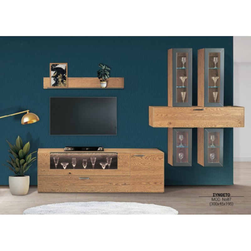 Σύνθεση με μοντέρνο και κομψό σχεδιαστικό στυλ με φωτισμό Led. Αποτελείται από βιτρίνες που μπορούν να διακοσμηθούν. Τα συρτάρια και ντουλάπια διαθέτουν μηχανισμό φρένου για μεγαλύτερη αντοχή στον χρόνο. Κατασκευασμένη από ξύλο ρουστίκ με συνδυασμό λάκας. Διαστάσεις: 300x45x195. Χρώματα δική σας επιλογής. Οι διαστάσεις μπορούν να διαφοροποιηθούν κατόπιν επικοινωνίας.