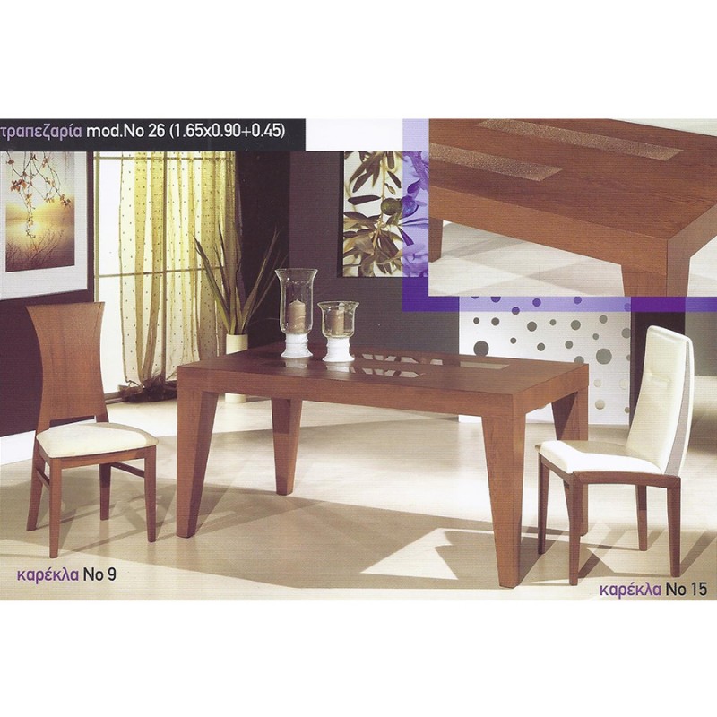 Μοντέρνα τραπεζαρία με κωνικά πόδια που ταιριάζει σε κάθε χώρο. Με 2 τζαμάκια που δίνουν μία διαφορετική οπτική στην τραπεζαρία. Κατασκευασμένη από ξύλο δρυς. Διαστάσεις: 165×90 + προέκταση 45. Χρώμα δικής σας επιλογής. Οι διαστάσεις μπορούν να διαφοροποιηθούν κατόπιν επικοινωνίας.